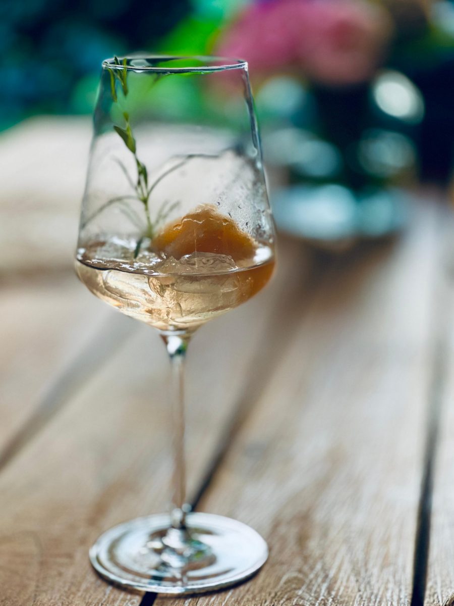 Loading ... Hausgemachter Vin d’Orange – serviert auf Eis, garniert mit einer frischen Orangenscheibe und einem Zweig Rosmarin.Rosé, Eau de vie, Bitterorangen, Zitronen und Vanille0,1 L 15% volFeiner Aperitiv 5,-€