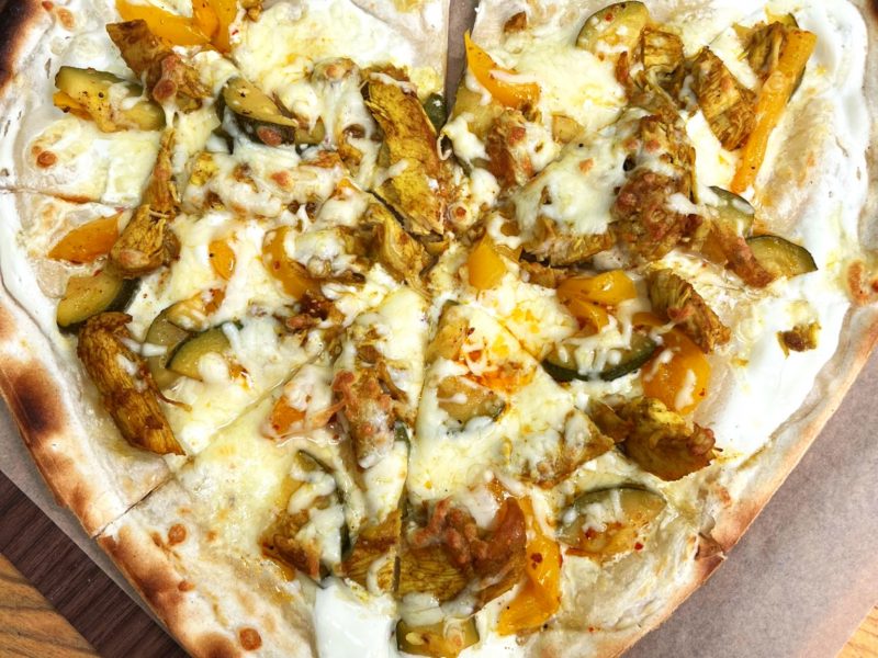 Flammkuchen mit Hähnchenbrust, Curry, Zucchini, Paprika, Zitrone und Mozzarella