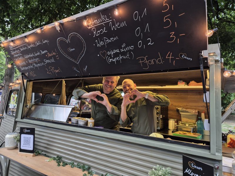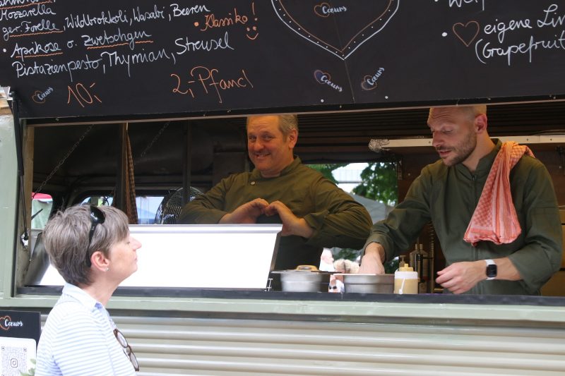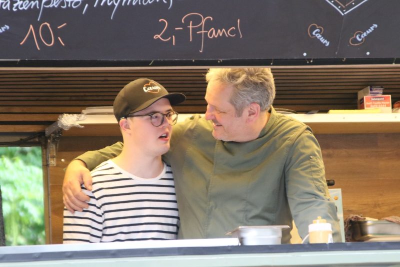 Ein echtes Highlight waren auch unsere neuen, im Corporate Design gestalteten Tische und Stühle, die für ein stimmiges Gesamtbild sorgten. Im Einsatz waren auch Samuel und Sebastian, die zunächst an der Kasse unterstützten und später mit viel Charme und Engagement beim Servieren der Flammkuchen glänzten. Großes Kompliment an euch beide – charmanter geht’s nicht!